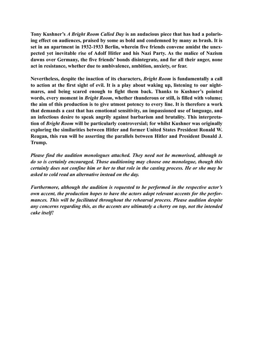 'a bright room called day' by tony kushner. You know the scene in the play where the black poodle turns into the devil and offers. A bright room called day by tony kushner paulinka: A bright room called day by tony kushner. Selected monologues from a bright room called day including video examples, context and character information.