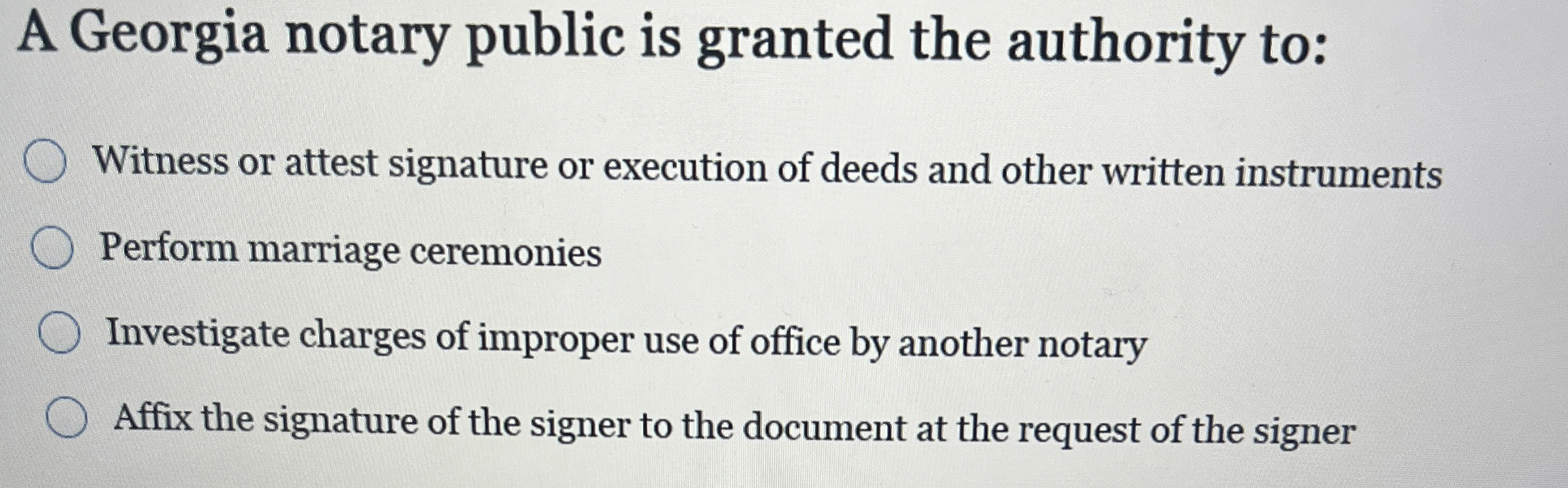 A notary public in georgia has the authority to witness or attest signature or execution of deeds and other written instruments, take. The authority of notaries public in georgia is defined under title 45, chapter 17 of the official code of georgia annotated (o.c.g.a.). '”notarial act” means any act that a notary public is authorized by law to perform and.