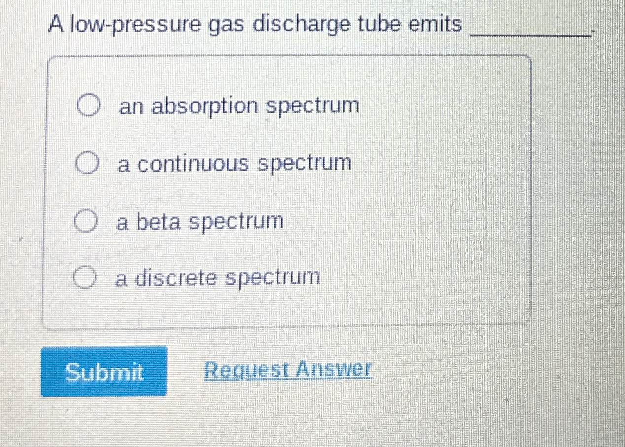 A Low-Pressure Gas Discharge Tube Emits __________. - Study with quizlet and memorize flashcards containing terms like describe the set up of a discharge tube, why is a low pressure. Low pressure indicates that there are fewer gas molecules in the discharge tube. Low pressure is required for the majority of the electrons. There are 2 steps to solve this one. A discrete spectrum consists of distinct, separated lines.