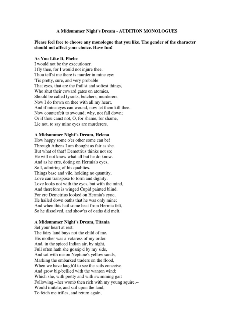 A midsummer night’s dream audition monologues (choose one) theseus now, fair hippolyta, our nuptial hour draws on apace. I have had a dream, past the wit of man to say what dream it was:. Each monologue entry includes the character's name, the first line of the speech, whether it is verse or prose, and shows the act, scene & line..