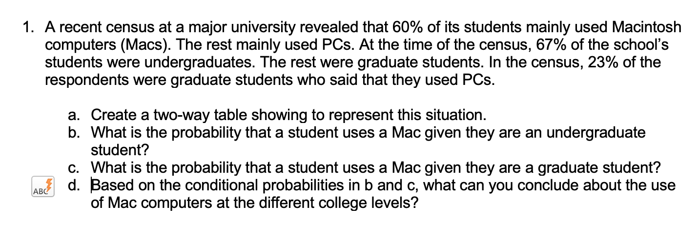 At the time of the census, 67 % of the school’s students were undergraduates. A recent census at a major university revealed that 60% of its students mainly used macs. At the time of the census, 67%. The rest mainly used pcs. At the time of the census, 67 %.