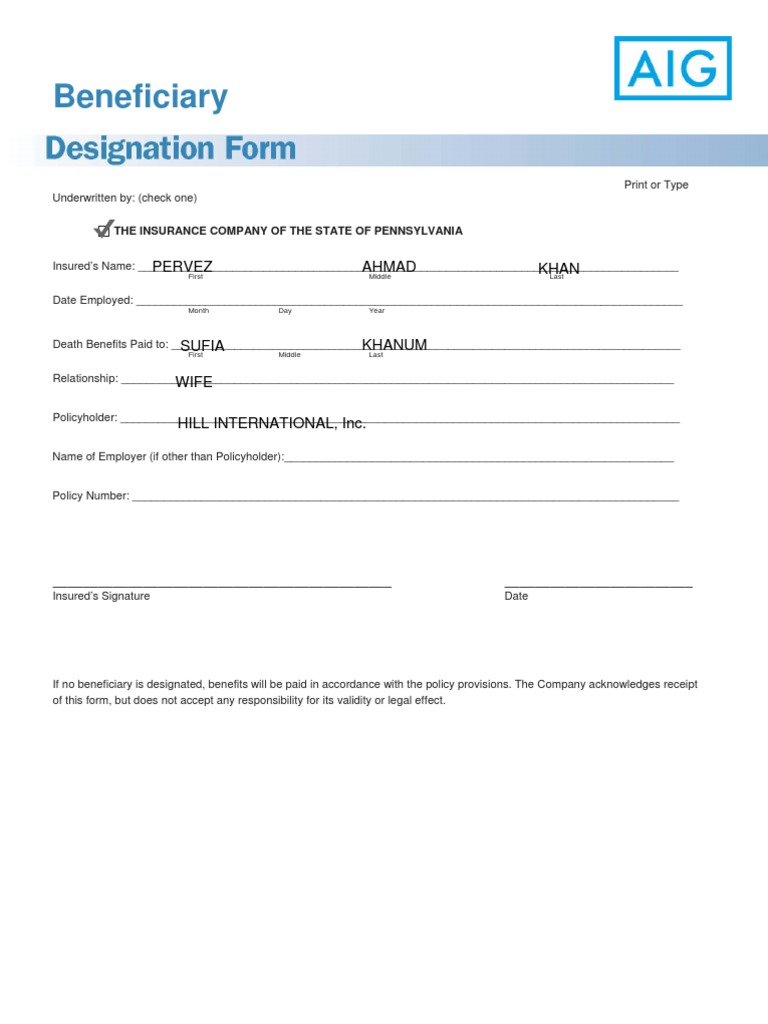 Aig Beneficiary Designation ≡ Fill Out Printable PDF Forms Online