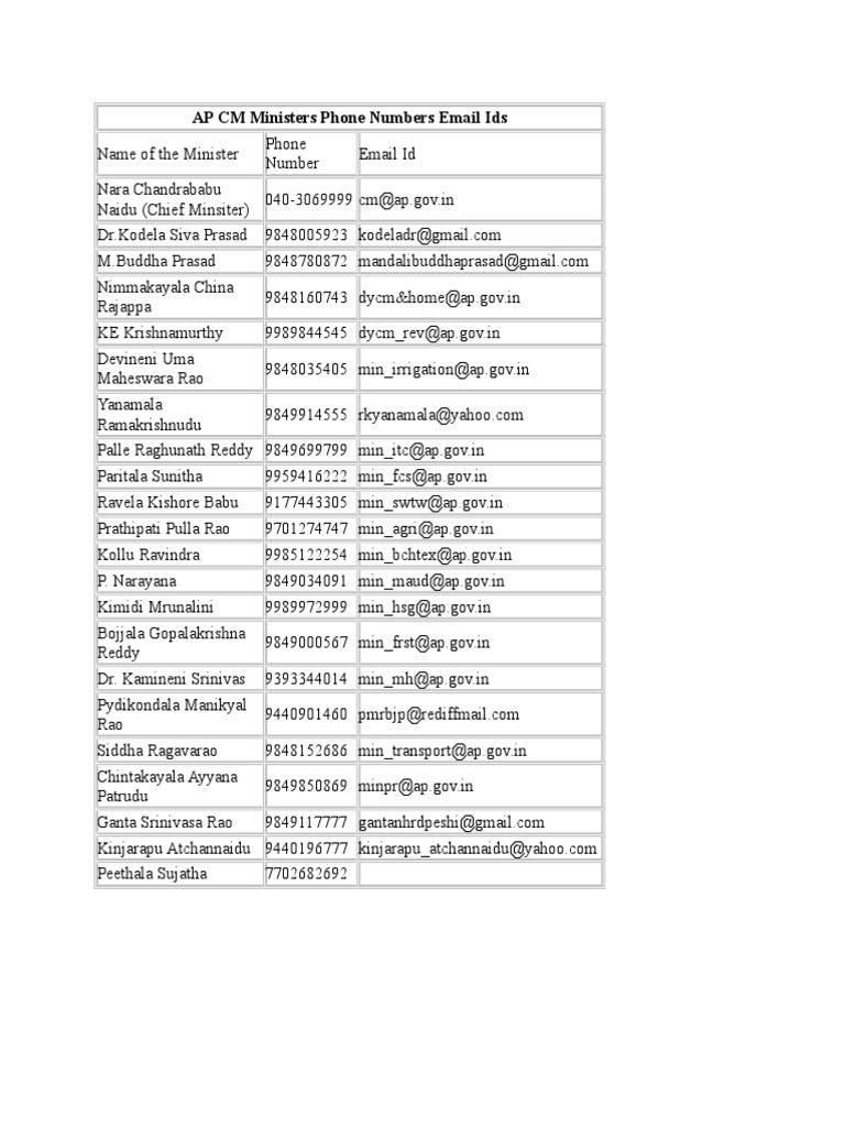 AP CM Ministers Phone Numbers Email Ids PDF