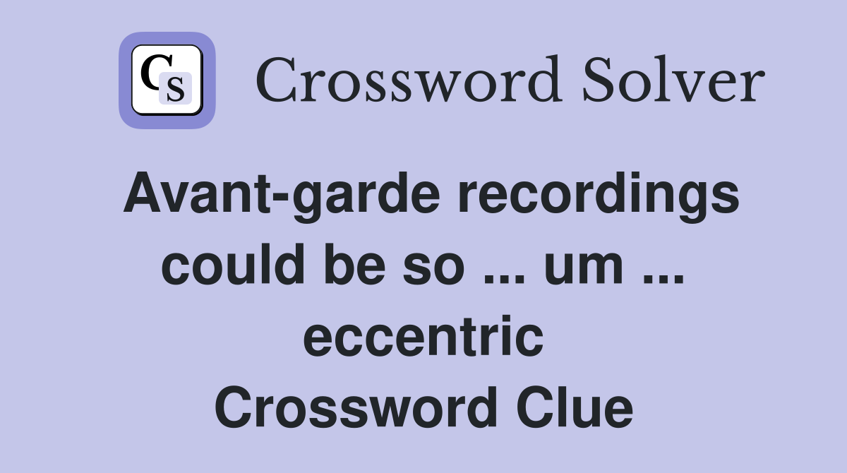 Today's crossword puzzle clue is a quick one: The crossword solver finds answers to classic crosswords and. We have found 40 possible answers for this clue in our. There are related clues (shown below). The crossword solver found 30 answers to avant garde, 3 letters crossword clue.