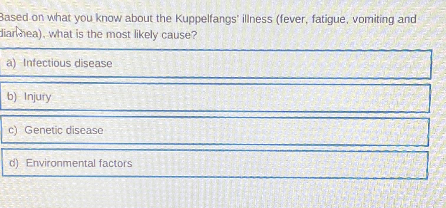 Based on what you know about the kuppelfangs' illness (fever, fatigue, vomiting and diarrhea), what is the most likely cause? Based on what you know about the kuppelfangs' illness (fever, fatigue, vomiting and diarrhea), what is the most likely cause? Based on what you know about the kuppelfangs' illness (fever, fatigue, vomiting and diarrhea), what is the most likely cause?.