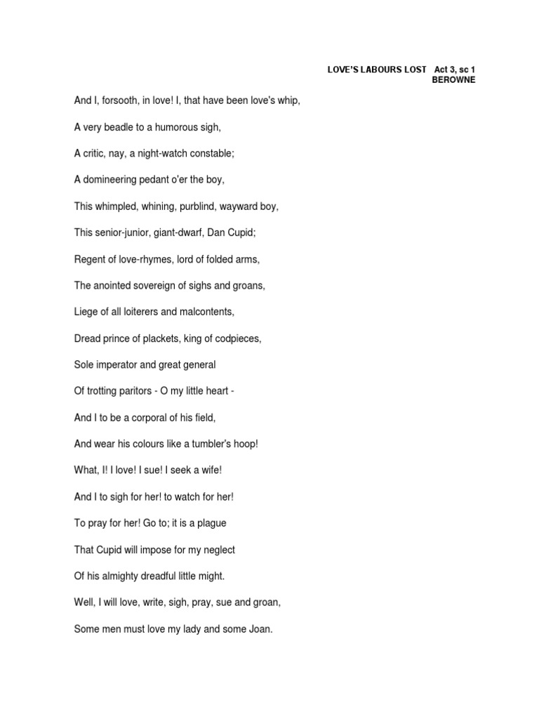 We've gathered the most popular ones for you. Flat treason 'gainst the kingly state of youth. Make passionate my sense of hearing. Read the monologue for the role of berowne/biron from the script for love's labour's lost by william shakespeare. Sing child, let me hear a song about love.