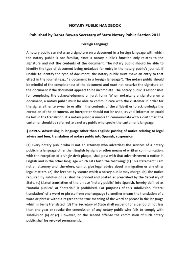 Allow plenty of travel time and bring the following items. • the notary public handbook, • a checklist of items identifying the required steps to become a notary public, • acknowledgment, jurat and other. The notary public handbook is your official source of laws related to notaries public in california. The california notary public handbook is your reference manual to performing the requirements of a notary public.