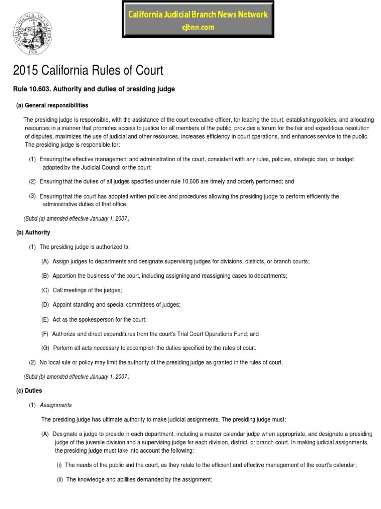 CRC Rule 10.603 Authority and Duties of Presiding Judge Judicial