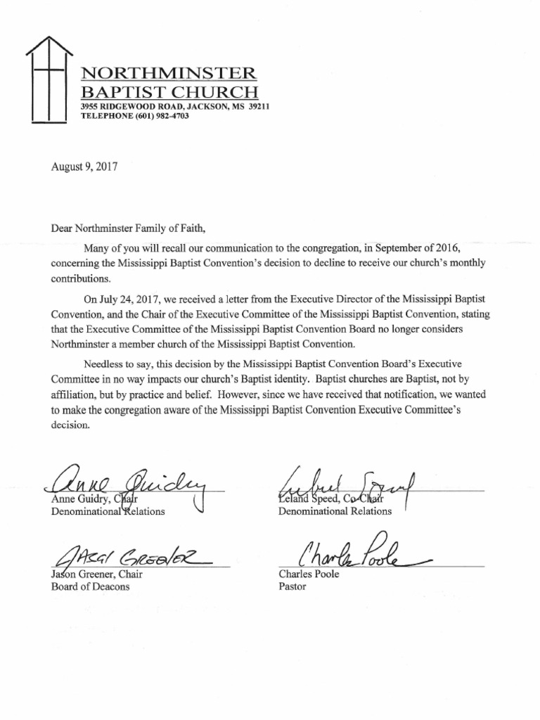 Letter From Northminster Baptist Church To Congregants PDF