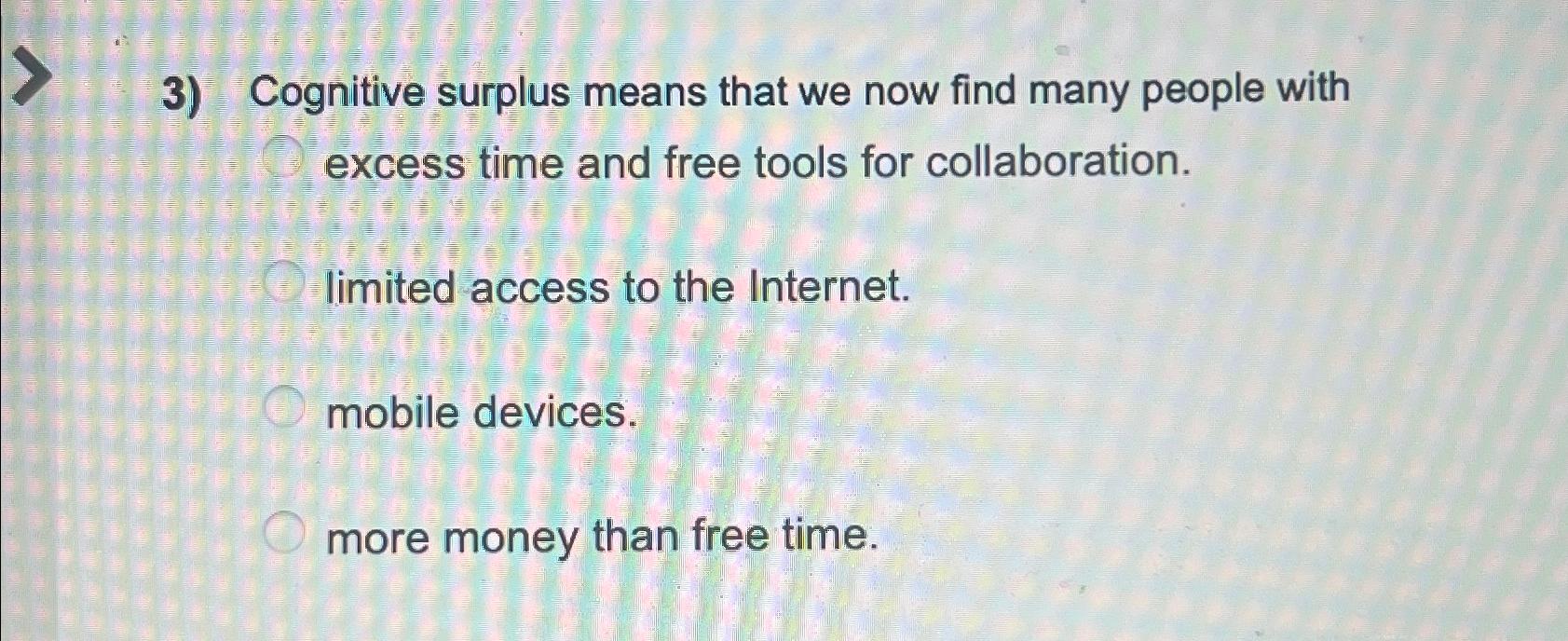 Shirky calls this resource created by the combination of these two elements, human generosity and digital technology, cognitive. Cognitive surplus means that we now find many people with a. Limited access to the internet. More money than free time. A set of flashcards for reviewing the concepts and terms from chapter 1 of a textbook on technology and society. One card asks about cognitive.