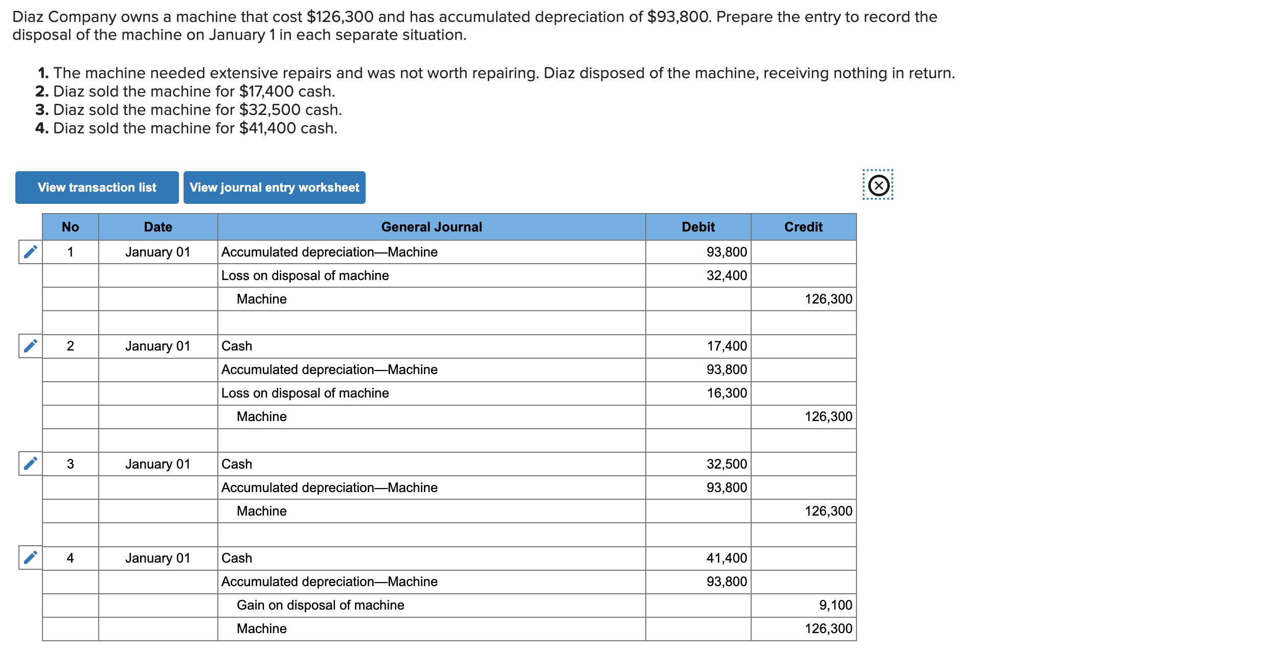 Diaz company owns a machine that cost $126,400 and has accumulated depreciation of $91,200. Diaz company owns a machine that cost $125,500 and has accumulated depreciation of $94,000. Prepare the entry to record the disposal of the. In order to record the. Prepare the entry to record the.