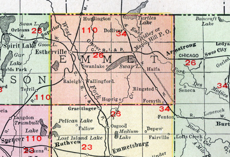 Emmet County, Iowa, 1911, Map, Estherville, Armstrong, Ringsted