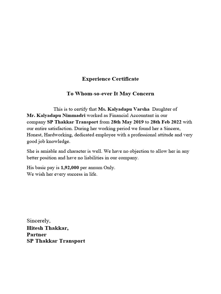 Work Experience Certificate Letter — Format Of Experience, 59 OFF