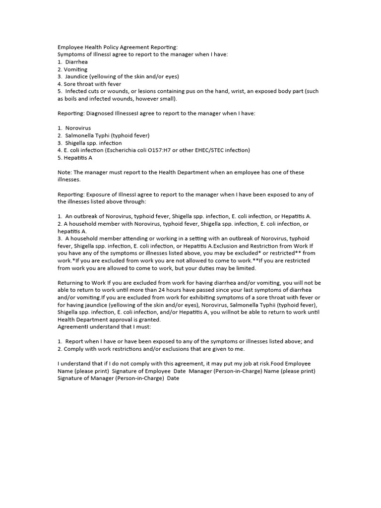 Employee health policy agreement written policy example reporting symptoms of illness i agree to report to the manager when i. If you are excluded from work for having diarrhea. Report when i have or have been exposed to any of the symptoms or illness listed above; As part of an employee health policy this agreement is to inform employees of.