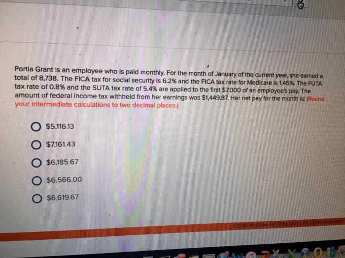 Portia grant is an employee who is paid monthly. First, we calculate the fica taxes for. The suta tax rate of 5.4% is applied to the first $7,000 of an employee's pay. For the month of january of the current year, she earned a total of 8,538.