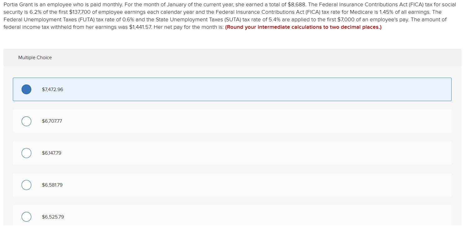 To calculate portia grant's net pay for the month, we need to subtract all the taxes from her gross pay. Portia grant is an employee who is paid monthly. For the month of january of the current year, she earned a total of $8,260. Portia grant is an employee who is paid monthly. Calculate fica taxes first, we.