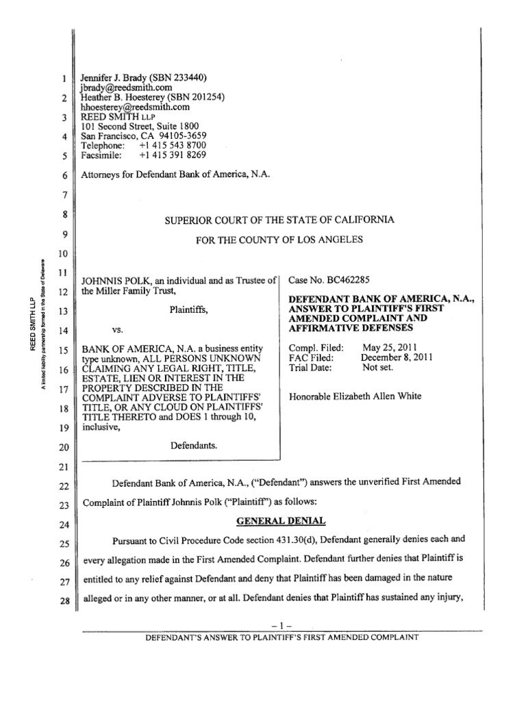 Bank of America's Answer to Complaint for Wrongful Foreclosure on