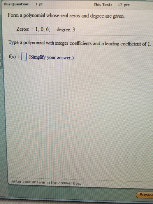 Further polynomials with the same zeros can be found by multiplying the. This expression can be expanded to. Create the term of the simplest polynomial from the given zeros. Form a polynomial whose zeros and degree are given. Type a polynomial with integer coefficients and a leading coefficient of 1 in the box below.