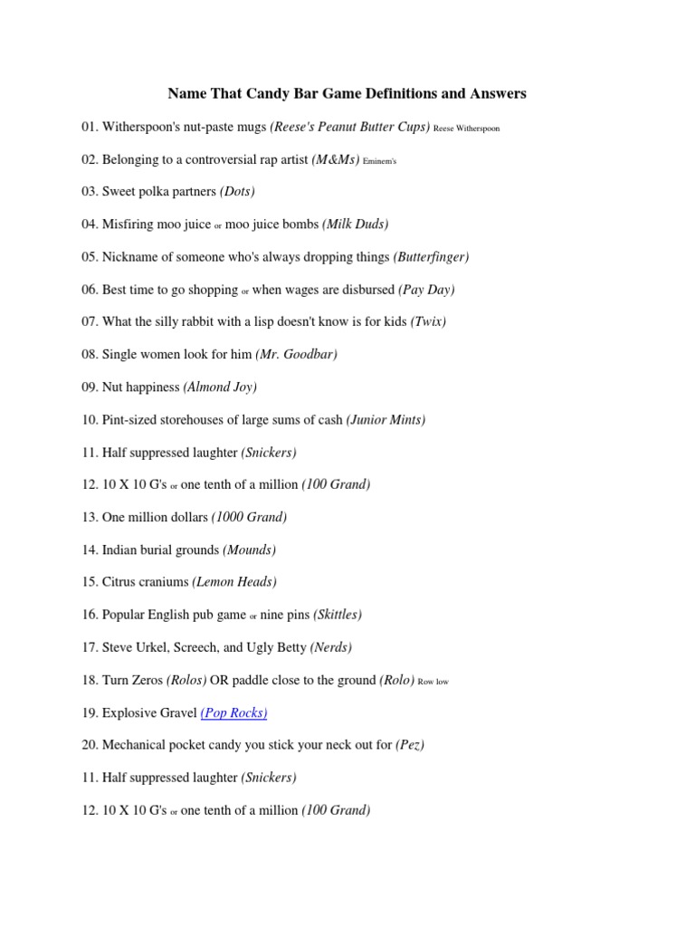 Name That Candy Bar Game Definitions and Answers PDF