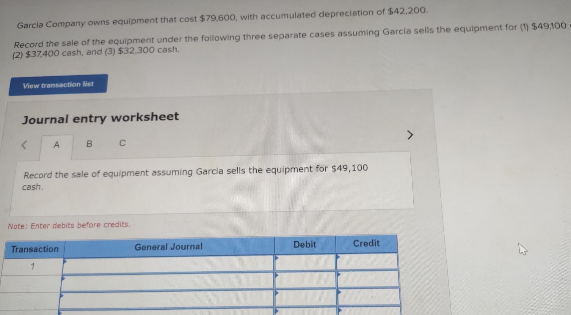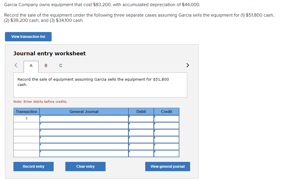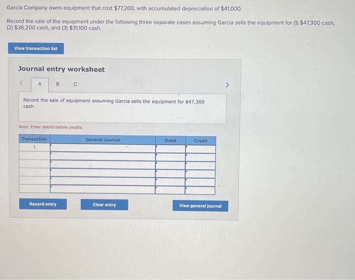 Owns equipment that costs $76,800, with accumulated depreciation of $40,800. Garcia company owns equipment that cost $82,400, with accumulated depreciation of $43,600. Owns equipment that cost $81,600, with accumulated depreciation of $43,200. Record the sale of the. Record the sale of the equipment under the following.
