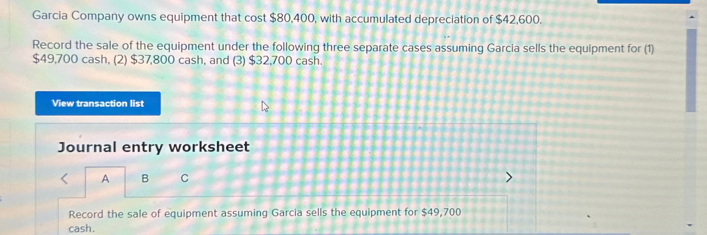 Garcia company owns equipment that cost $82,400, with accumulated depreciation of $43,600. Record the sale of the. Record the sale of the equipment under the following. Owns equipment that cost $82,800, with accumulated depreciation of $43,800. Garcia sells the equipment for cash. Garcia sells the equipment for cash. Garcia sells the equipment for cash. Owns equipment that cost $76,800, with accumulated depreciation of$40,800. Owns equipment that costs $76,800, with accumulated depreciation of $40,800. Owns equipment that cost $81,600, with accumulated depreciation of $43,200.