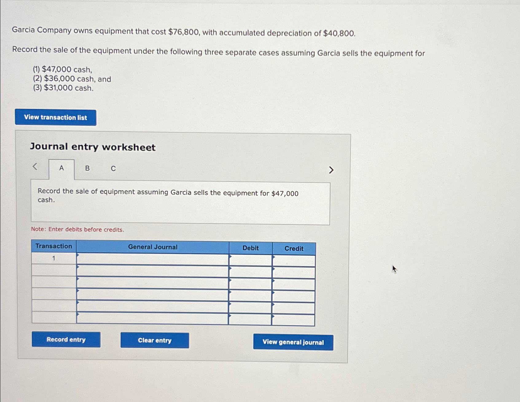 Owns equipment that cost $76,800, with accumulated depreciation of$40,800. Owns equipment that costs $76,800, with accumulated depreciation of $40,800. Garcia sells the equipment for cash. Garcia sells the equipment for cash. Record the sale of the equipment under the following.