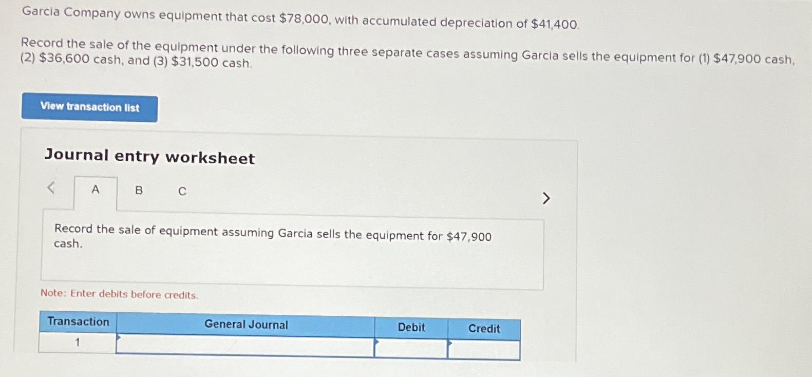 Garcia sells the equipment for cash. Garcia sells the equipment for cash. Record the sale of the. Owns equipment that cost $76,800, with accumulated depreciation of$40,800. Garcia company owns equipment that cost $82,400, with accumulated depreciation of $43,600.