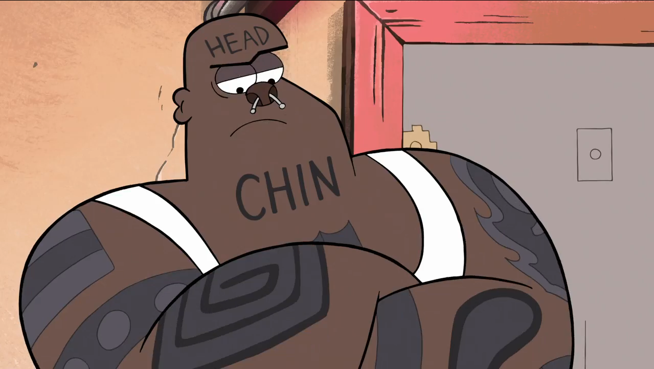 Gravity Falls Tattoo Guy - He is a big and bulky man with head tattooed on his head, chin tattooed on his chin, and other tattoos all over his body.
