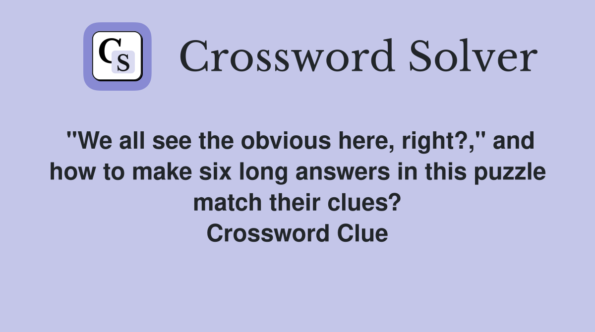 Here is the answer for the crossword clue how obvious!. We have found 40 possible answers for this clue in our database. If you're looking for help with the how obvious! clue in daily themed crossword, we have the answer to assist you with your. There are related clues (shown below).