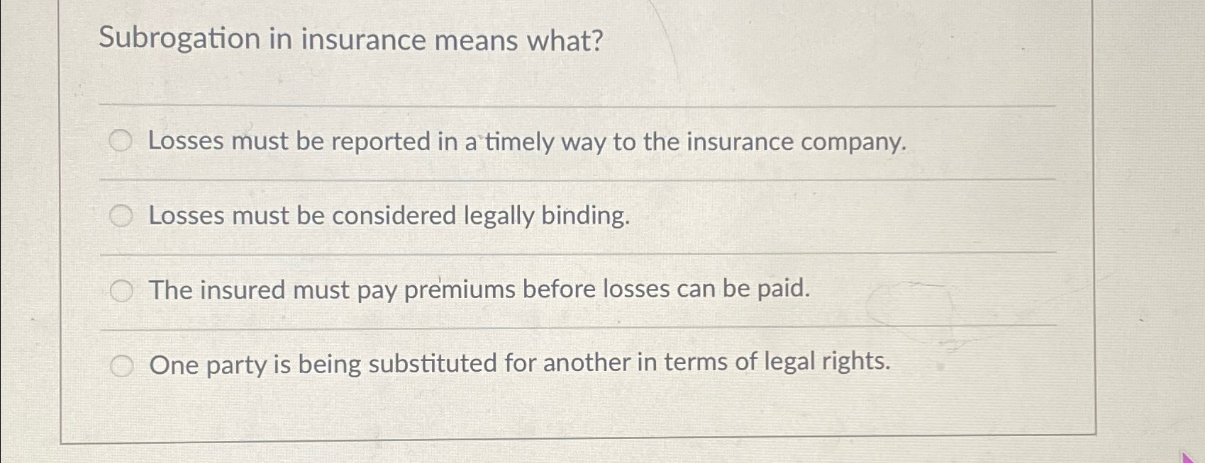 Solved Subrogation in insurance means what?Losses must be