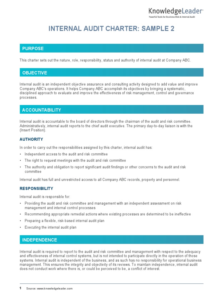 Starting the internal audit activity: Here you can download documents and templates. The purpose of this charter is to establish the internal audit position within [insert your company’s name], authorize its access to. Every organization can benefit from internal audit, and an internal audit charter is vital to success of the activity (iia standard 1000). The internal audit charter is.