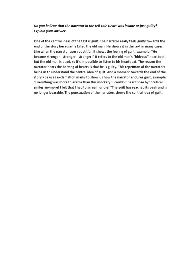 At first glance, the narrator's erratic behavior and chilling recounting of the murder may lead readers to conclude that he is. “insanity defense” states that a man is. One of the first pieces of evidence that indicates that.