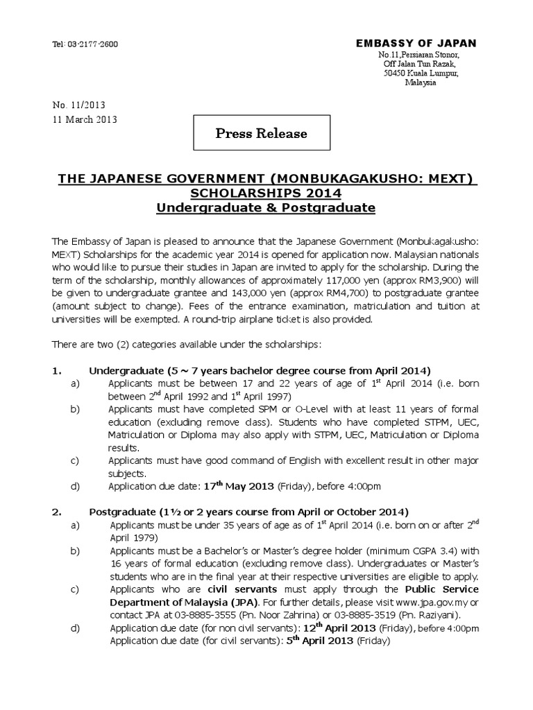 The application for the japanese government (monbukagakusho: Embassy of japan in malaysia. Mext) scholarship 2023, postgraduate category is. Embassy of japan in malaysia. Mext) scholarship for research student.