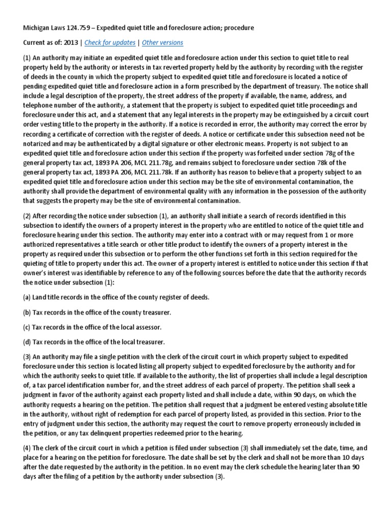 Michigan Laws 124.759 Expedited Quiet Title and Foreclosure Action