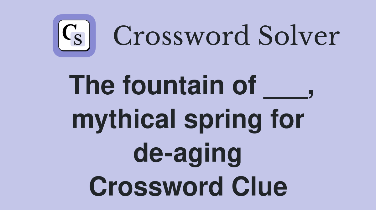 The top solutions are determined by popularity, ratings and frequency. Here we have collected for you all mythical spring that reverses aging crossword clue answers. The crossword solver found 30 answers to mythical spring that reverses aging, 15 letters crossword clue. There are related clues (shown below). If you are stuck, just find.