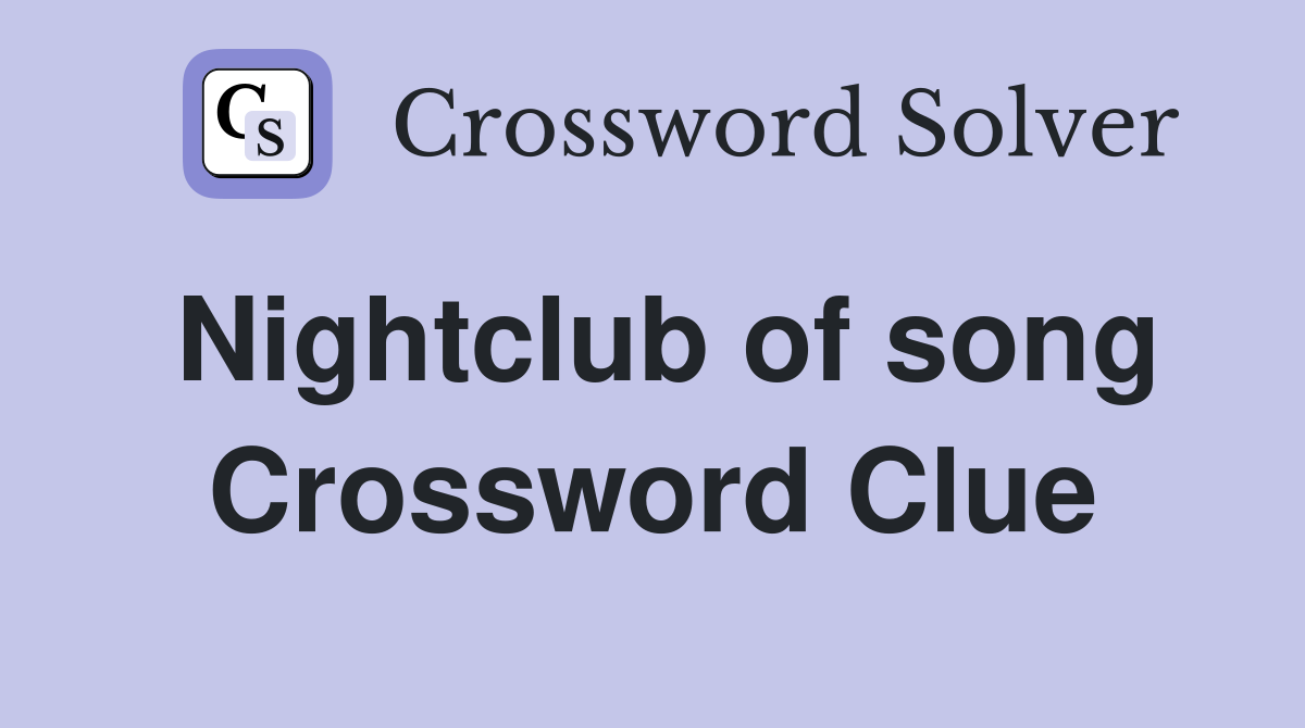 Now, let's get into the answer for nightclub crossword clue most recently seen in the la times crossword. Here are the possible solutions for nightclub clue. We have found 40 possible answers for this. All crossword answers with 5 letters for nightclub found in daily crossword puzzles: The crossword solver found 39 answers to nightclub, 10 letters crossword clue.