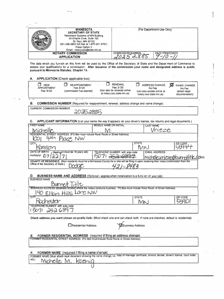 MICHELLE VRIEZE Michelle Koenig Minnesota Notary Application 1001 4th