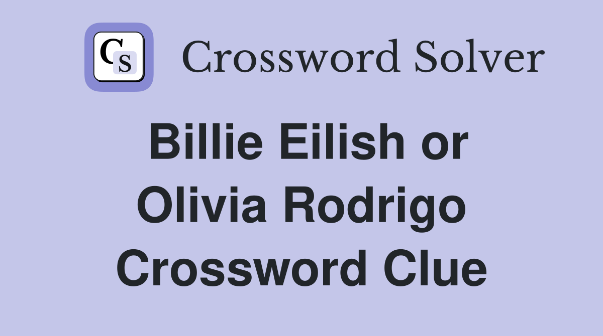 Here are the possible solutions for olivia rodrigo or billie eilish clue. It was last seen in the new york times quick crossword. The crossword solver found 30 answers to billie eilish or olivia rodrigo, 8 letters crossword clue. The top solutions are determined by popularity, ratings and frequency. We solved this clue, that last appeared on november 25, 2022.