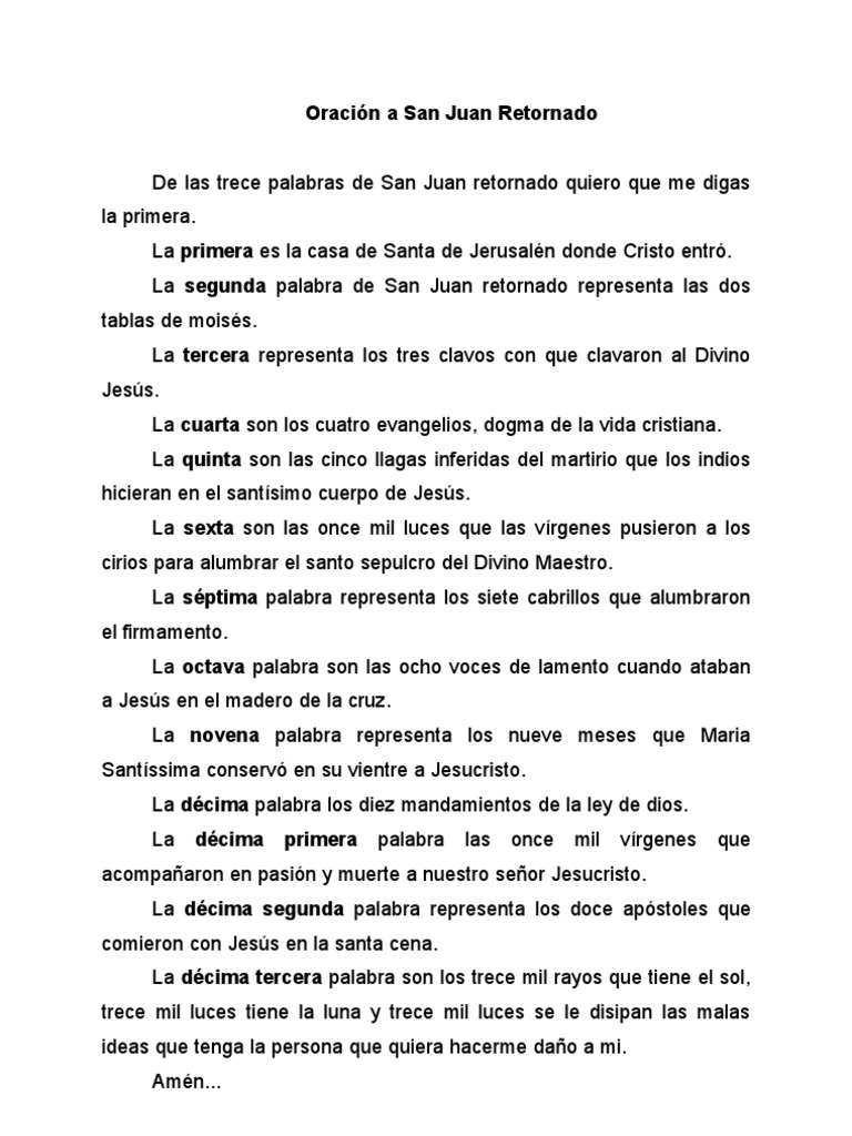 Las trece palabras de san juan retornado. Esta oración va ofrecida al santo ángel de la guarda, por don juan del espíritu del tabaco, por don juan del pensamiento,. La oración de san juan retornado es muy poderosa. Ya sabes para qué sirve esta oración, entonces puedes comenzar a hacerla. La oración a san juan retornado tiene un poder especial.