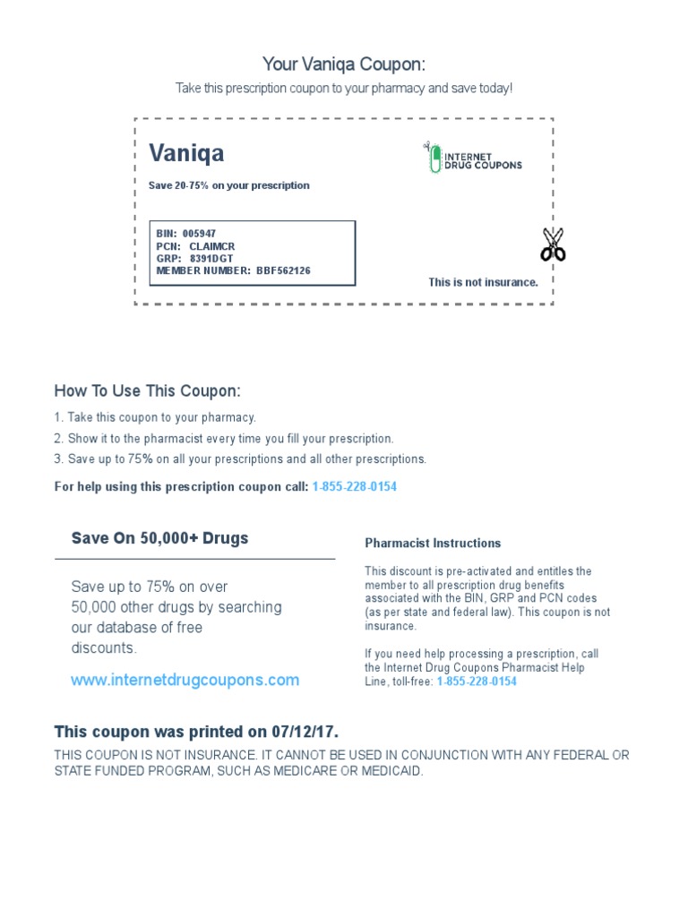 See the cheapest pharmacy price and start saving on vaniqa today. Our manufacturer coupon database contains links to coupons, vouchers,. Get free vaniqa coupons instantly and save up to 80%. Get vaniqa coupon card by print, email or text and save up to 75% off vaniqa at the pharmacy. Find the best price for vaniqa with a free prescription discount.