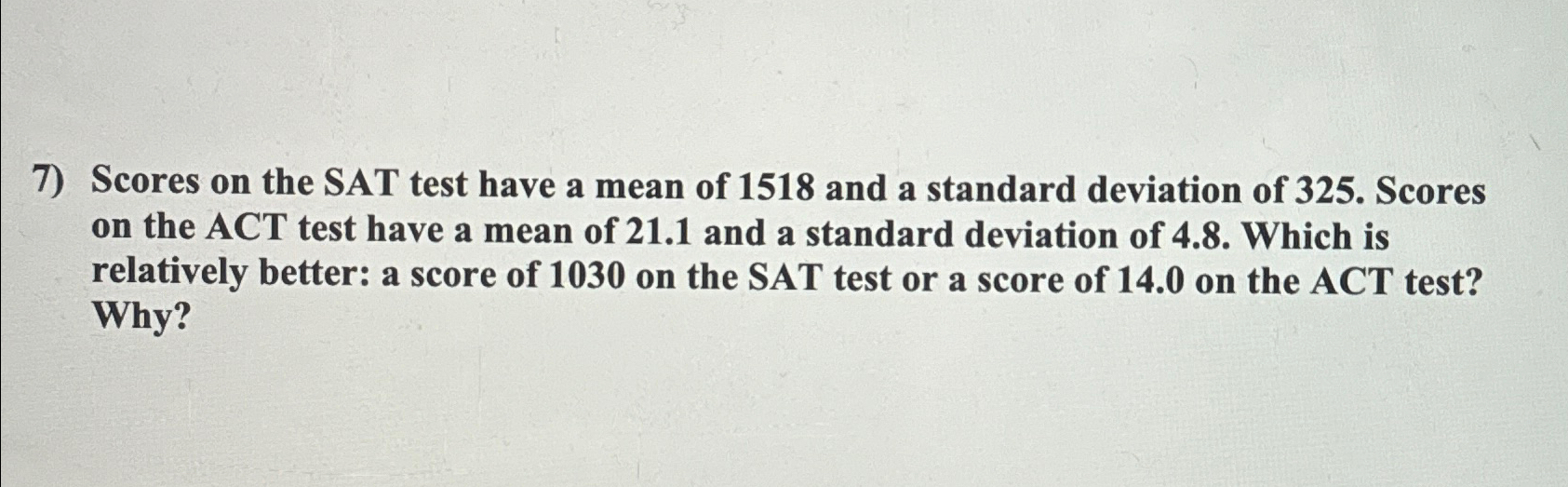 The mean sat score is 1518, which means a score of 1190 is below the mean. However, we also need to consider the standard. Choice a claims that an act score of 17 is relatively better than an sat score of 1490. Scores on the sat test have a mean of 1518 and a standard deviation of 325.