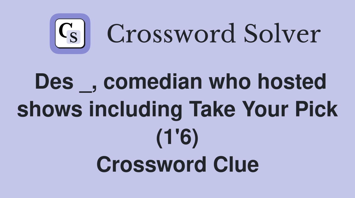 Des _, comedian who hosted shows including Take Your Pick (1'6