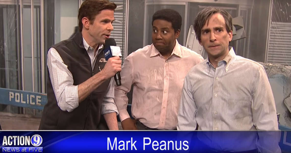 A correspondent (mikey day) for action 9 news at five (which is itself a recurring sketch) covers a disaster that happened at the city's name. Action 9 news at five.