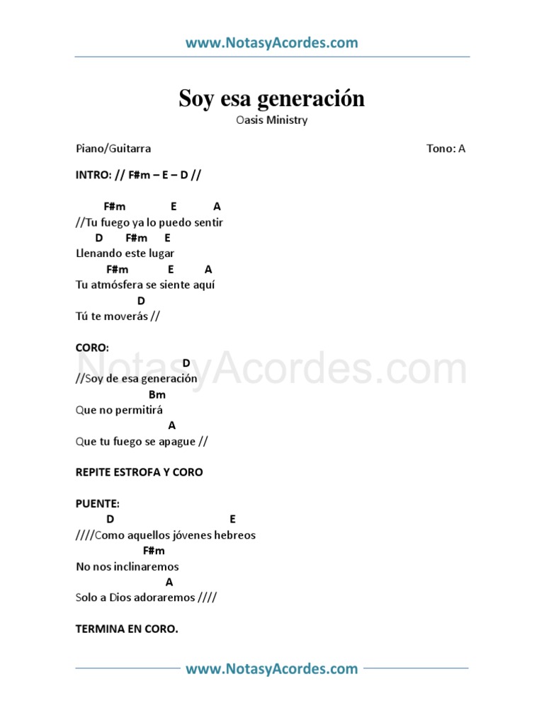Learn to play guitar by chords / tabs using chord diagrams, watch video lessons and more. Soy esa generación chords by oasis ministry. Toca la guitarra, el ukulele o el piano con acordes y diagramas. Cómo tocar soy esa generación, oasis ministry. Cómo tocar soy esa generación, oasis ministry. [intro] a (pad) a g# f# a g# e a g# f# a g# f# a g# e a g# f# [estrofa] f#m e/g# a tu fuego ya lo puedo sentir d f#m e llenando este lugar f#m. Acordes para oasis ministry / soy esa generación. Soy esa generación oasis ministry piano/guitarra tono: