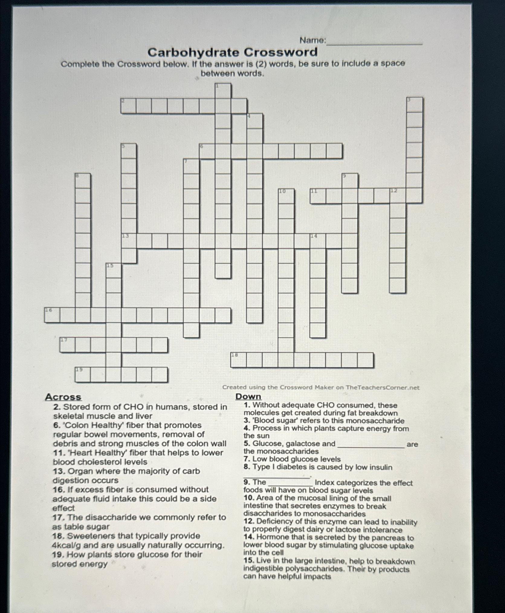 Carbohydrate Crossword Puzzle