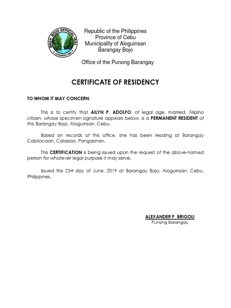Barangay Certificate Residency Sample barangay kulese