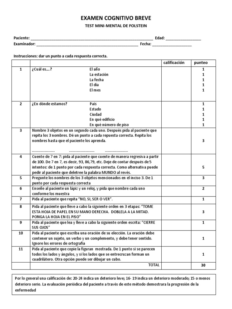 Examen Cognitivo Breve Test MiniMental De Folstein Cognición