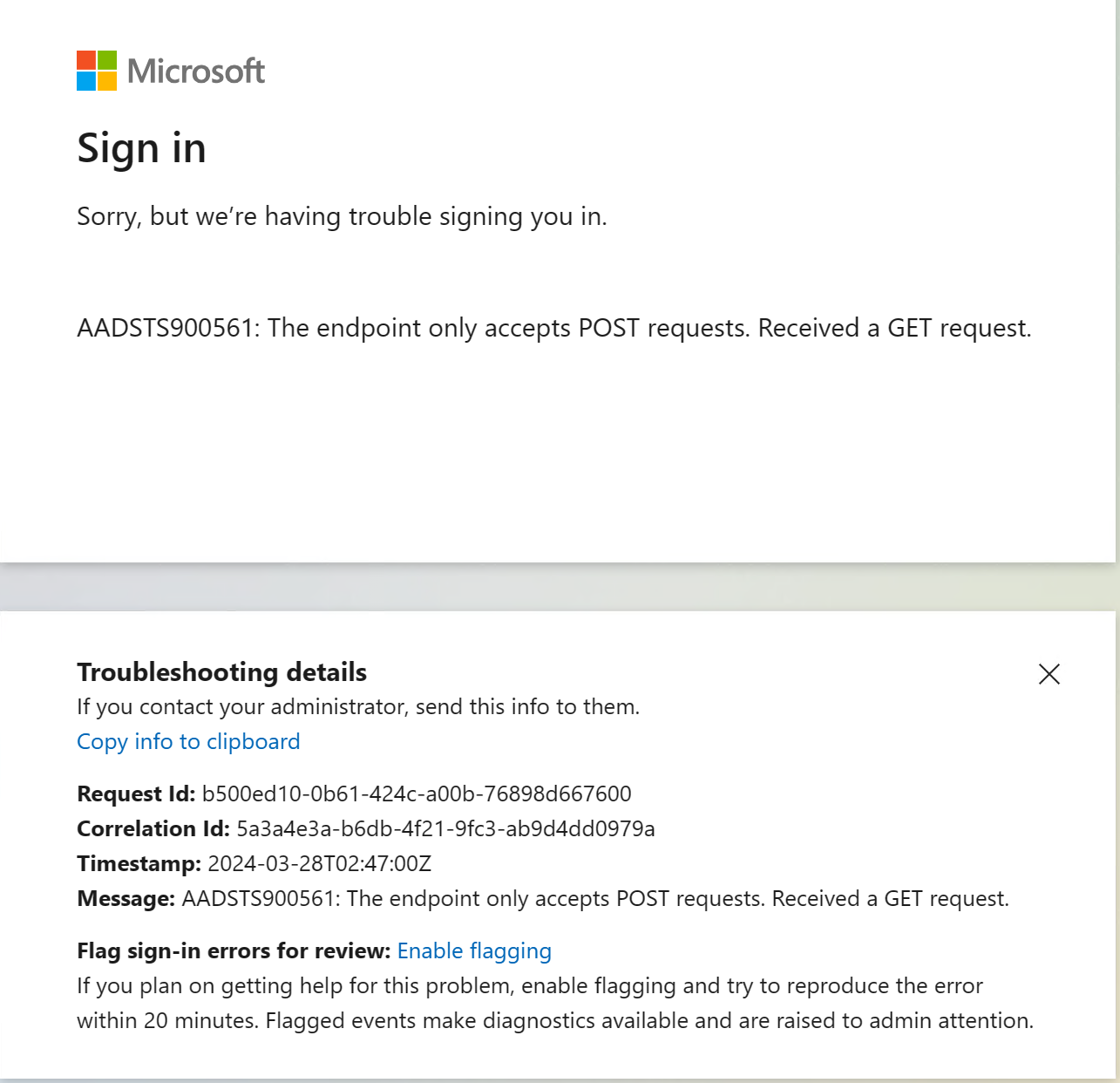 [Fix] Microsoft AADSTS900561 The endpoint only accepts POST requests
