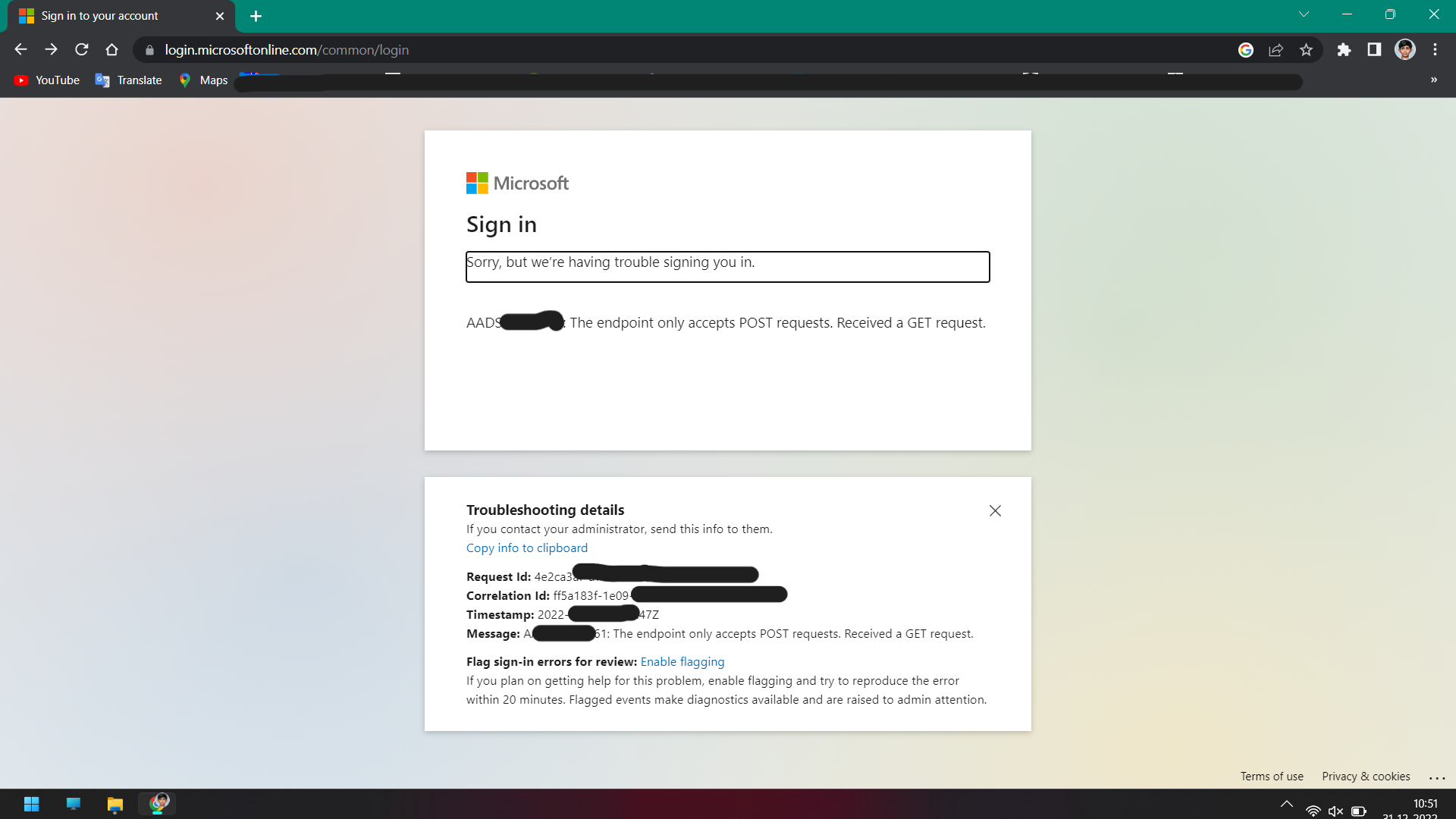 Error AADSTS900561 The endpoint only accepts POST, OPTIONS requests