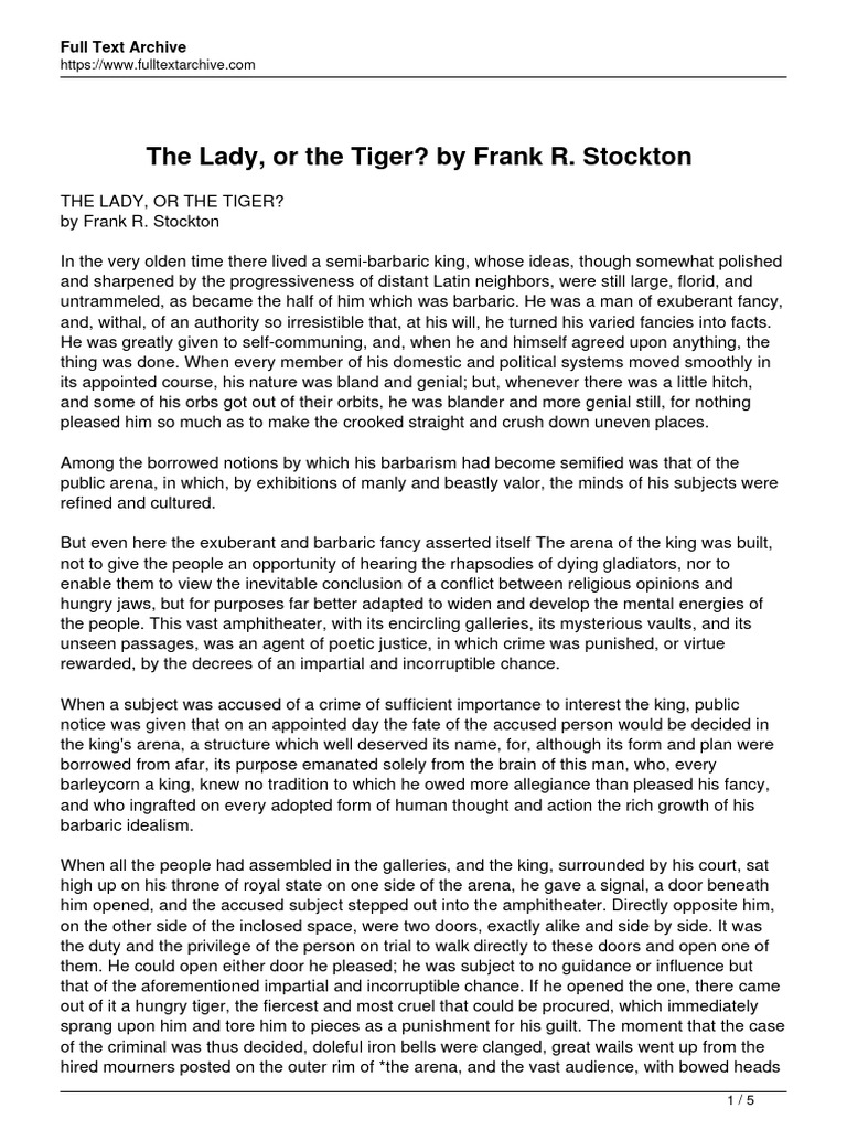 The Lady Or The Tiger Short Story Pdf - The lady, or the tiger? The lady, or the tiger?